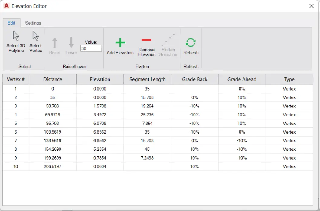 i. Refresh – refresh data in Elevation Editor dialog. Use this when element is edited outside Elevation Editor to refresh 3d polyline data.