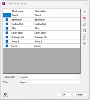 The “COGO Points Legend” command is used to create a legend of COGO point markers (symbols) from the drawing, a selected window, or a viewport. Legends can be updated automatically based on the defined area or viewport. You can optionally include a count column and save item descriptions and order for future reuse.