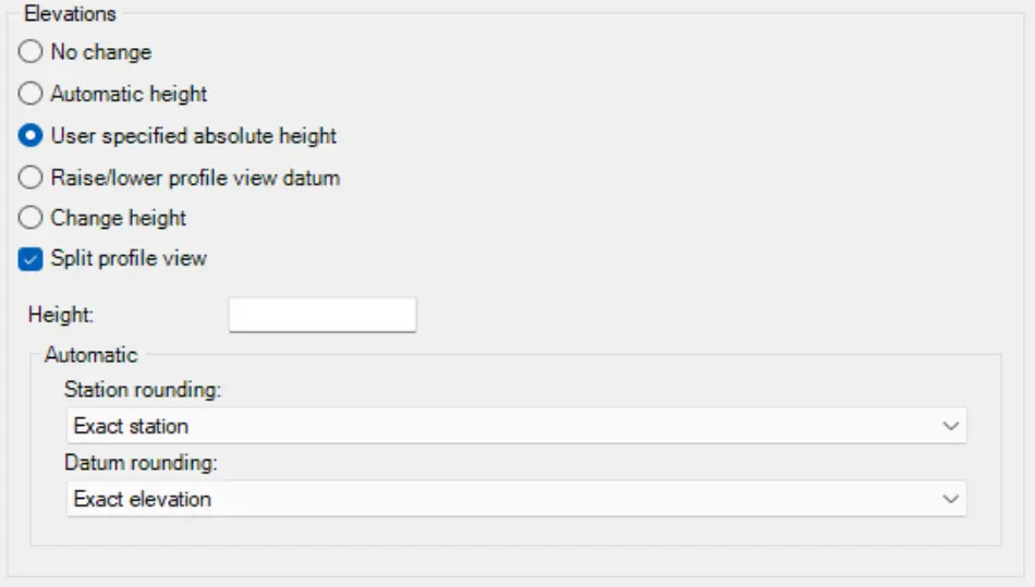 b. User specified absolute height – set the absolute height for all profile views or select split profile view option. If you want to split profile views, enter absolute height and select station and datum rounding options.