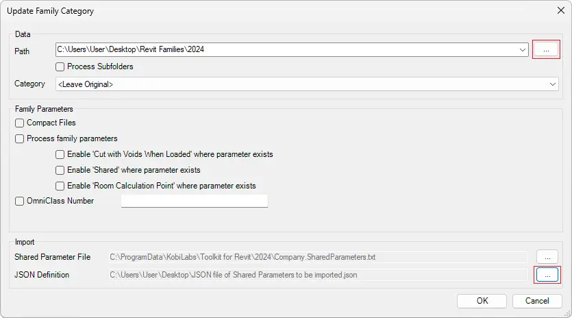 Update Family Category dialog box opens up. Under Data press (three dots) and select the folder in which you have all the families that you want to update. Under Import, JSON Definition select