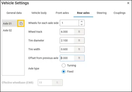 Effective wheelbase (EWB): The effective wheelbase is the adjusted distance between the front axle and the rear turning axle, which reflects the vehicle's actual turning behavior rather than its physical wheelbase. This option is locked in case of fixed axle.