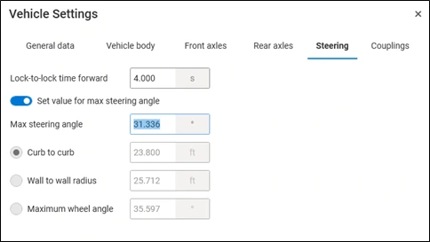 Set value for max steering angle: If the switch is on, you can enter the value for maximum steering angle. Options Curb to curb, Wall to wall radius and Maximum wheel angle are disabled. If the switch is off, the value for maximum steering angle is disabled. You can enter the Curb to curb value, or Wall to wall radius value, or Maximum wheel angle value.