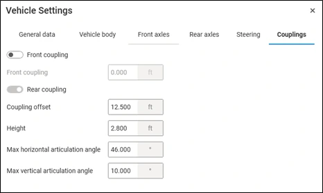 Rear coupling: Coupling mechanism located at the rear of a vehicle or trailer, designed to attach and tow an additional trailer or unit in a multi-vehicle configuration. When the switch is on, you can define coupling offset, height, max horizontal articulation angle and max vertical articulation angle. If the vehicle does not have rear coupling, turn the switch off. In this case, rear coupling parameters are disabled.