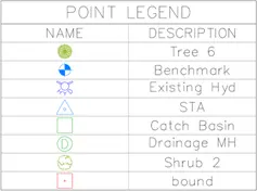 The “COGO Points Legend” command is used to create a legend of COGO point markers (symbols) from the drawing, a selected window, or a viewport. Legends can be updated automatically based on the defined area or viewport. You can optionally include a count column and save item descriptions and order for future reuse.