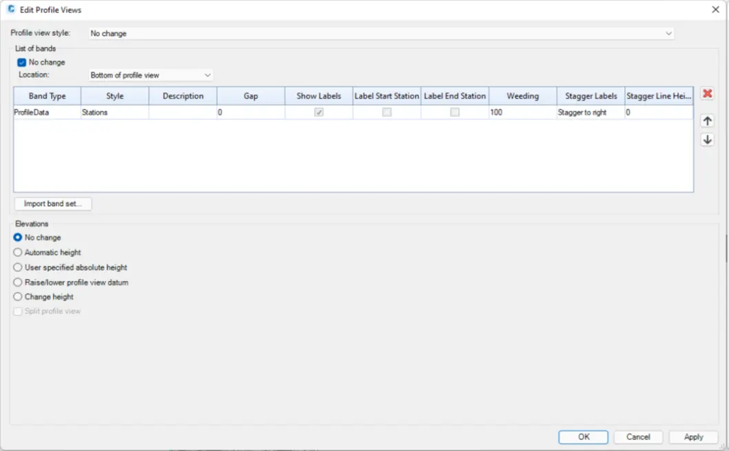 Edit bands properties. You can edit the following properties (when it is possible to edit them according to the band type): style, gap, show labels, label at start station, label at end station, profile 1, profile 2, weeding, stagger labels and stagger line height. Profile 1 and profile 2 columns are hidden when selected profile views are from different alignments.