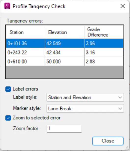 Check the “Label errors” option to label detected tangency errors in the Profile View. Select the label and the marker style from the drop down.