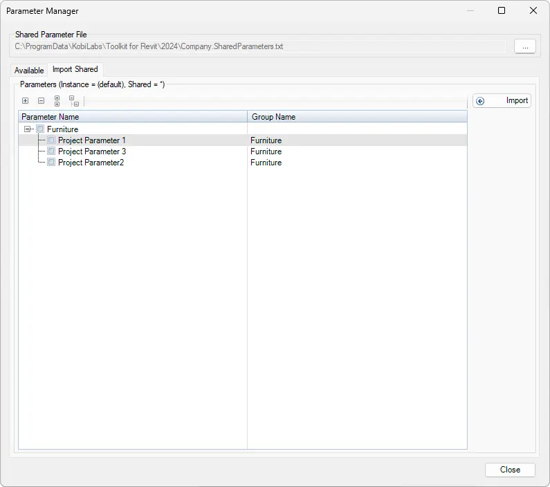 To add Shared Parameters, select Import. Add Shared Parameter dialog opens up, where you can select a Group for Shared Parameter and check if you want to import it as Instance Parameter.